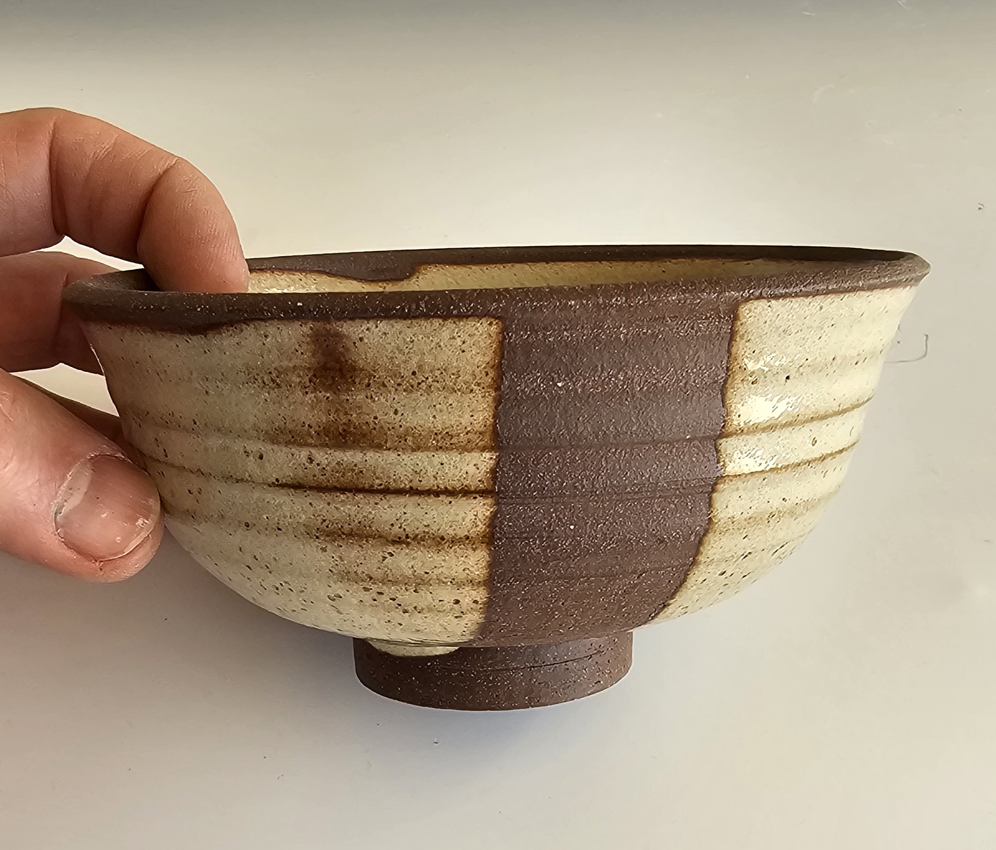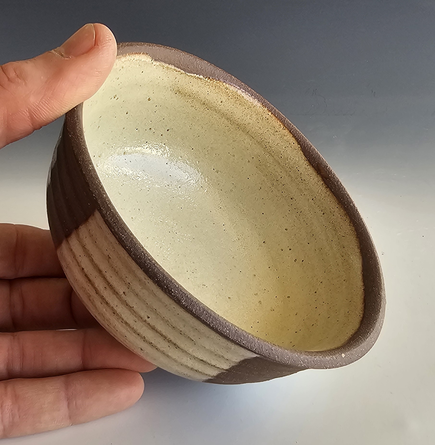 Serving bowl made from red stoneware clay with shino glaze. Measures: 2.75" H x 5.5" Dia. Weighs: 1 lbs. Dishwasher/food safe. Handmade in Texas by Jaime Marum. Price includes shipping and packaging.