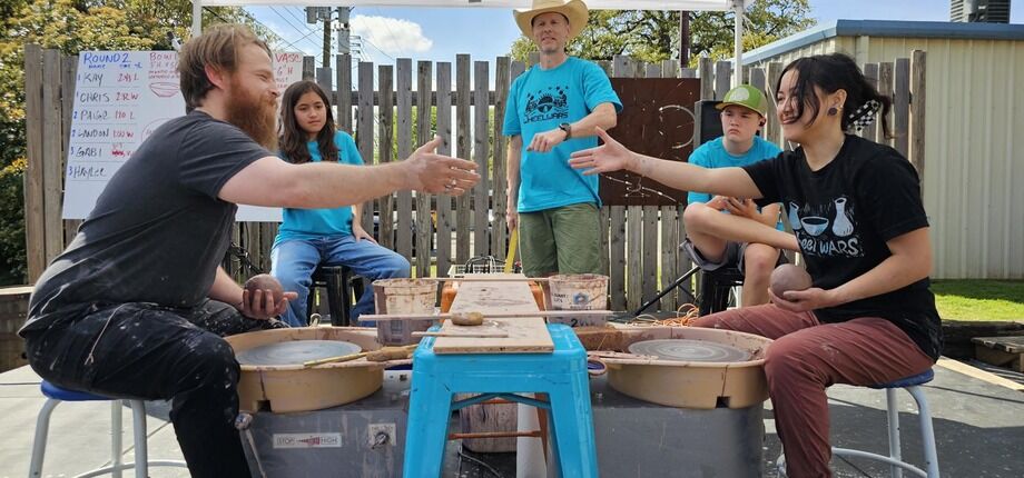 Wheel Wars is a fast and fun pottery wheel competition. This year, to celebrate the 5th anniversary, four local DFW pottery studios will have teams competing against each other on 4 wheels. Challenges will be tougher and more chaotic than before. Points from the Judge will be accumulated from each challenge to determine the winning studio.